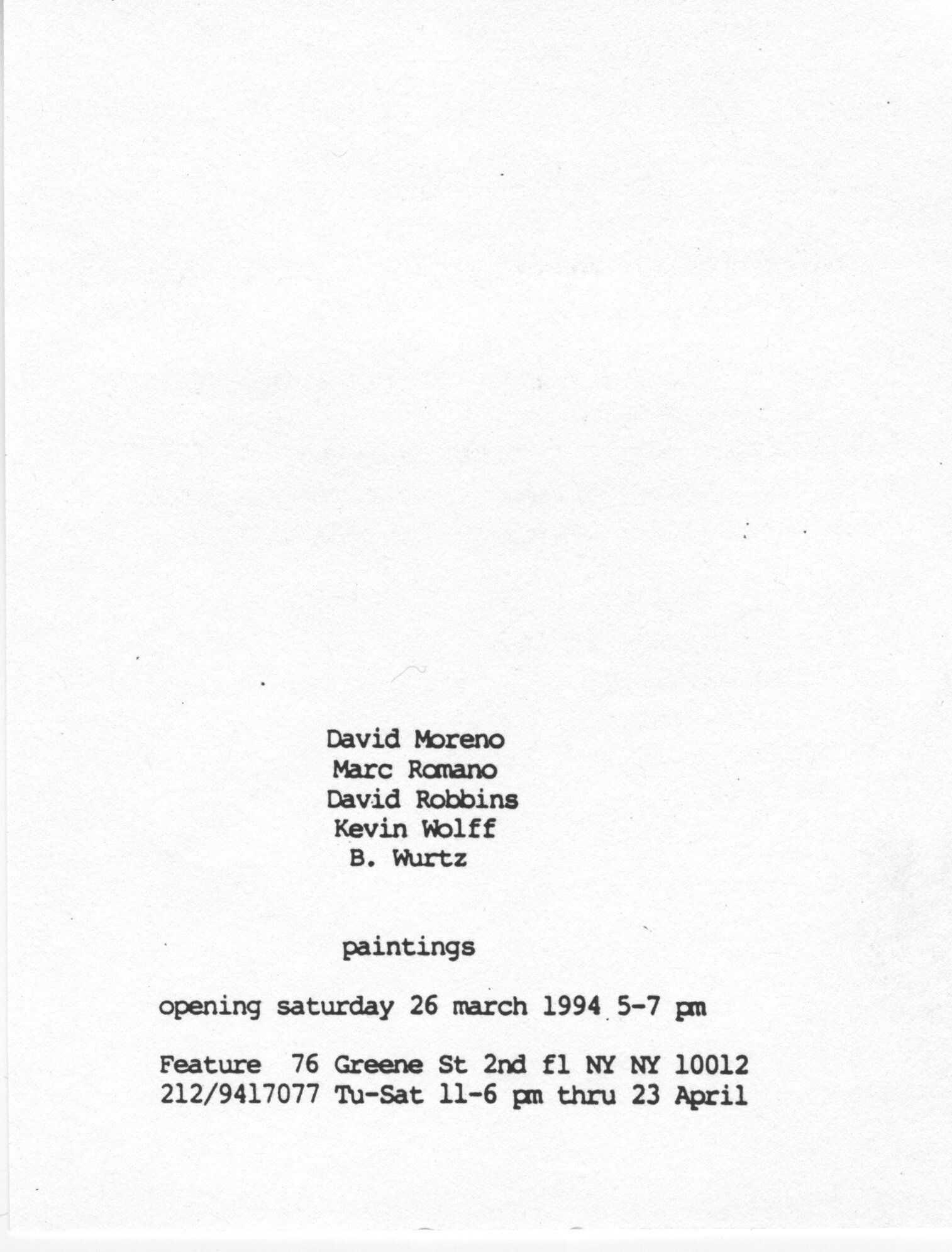 Paintings: David Moreno, David Robbins, Marc Romano, Kevin Wolff, B. Wurtz