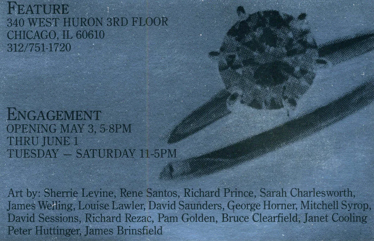 Engagement: James Brinsfield, Sarah Charlesworth, Bruce Clearfield, Janet Cooling, Pam Golden, George Horner, Peter Huttinger, Louise Lawler, Sherrie Levine, Richard Prince, Richard Rezac, Rene Santos, David Saunders, David Sessions, Mitchell Syrop, James Welling